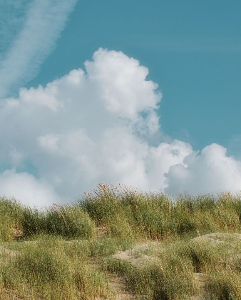 Es ging über eine große Düne und über 2 Fahrradwege bis ich dann endlich mein geliebtes Meer sah. Herrlich! Ein riesiger nahezu menschenleerer weißer Puderzucker Sandstrand, Wattewölkchen und das Dünengras was sich im Wind wiegt. Ein unbeschreibliches Gefühl von Freiheit.