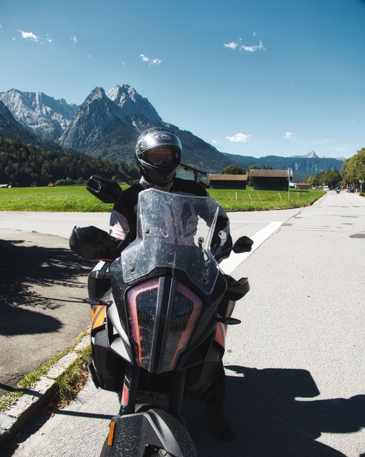 Wir fahren durch Garmisch-Partenkirchen und halten danach kurz an der Straße damit ich nochmal ein tolles Bild der Zugspitze machen kann und natürlich von der coolen Dörte vor der Zugspitze. Ich hoffe die Menschen die hier leben, wissen wie schön sie es haben.
