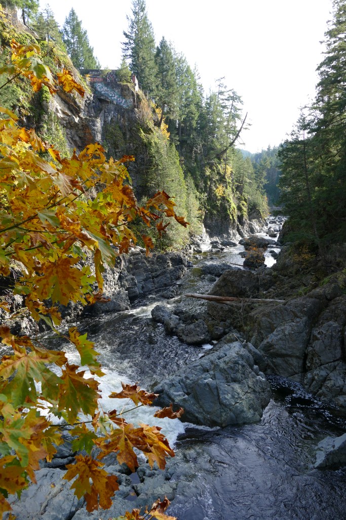 Das kleines 8 jähriges Äffchen wille an jeder möglichen Stelle die gefährlichen Klippen lang runter klettern und ist jedes mal bockig, wenn wir sie davon abhalten. Stattdessen machen wir uns auf dem Weg zu einem der offiziellen Aussichtspunkte, welcher mit Treppen und Geländer ausgestattet ist. Von dort hat man einen tollen Blich auf den rauschenden Sooke River. Was ich aber noch wesentlich spannender finde, ist dieses alte Steingebäude, welches da am Felsen klebt und voll mit Graffiti ist und die alte Autositzbank unterhalb auf den Felsen. Meine „kanadischen Eltern“ erklären mir dann, dass die hier vor ein paar Jahren mal ein fancy „Burghotel“hinbauen wollten. Das Projekt scheiterte allerdings und das Ganze wurde zu einem Lost Place in dem Underground Parties statt fanden. Richtig spannend! Allerdings kamen dann 2 junge Männer ums Leben als sie nachts mit ihrem Truck von der Straße abkamen, im Fluss landeten und dort ertranken. Daraufhin wurde das komplette Gelände großräumig abgesperrt, mit einem Zaun den man (leider) wirklich nicht überwinden kann. Schade!