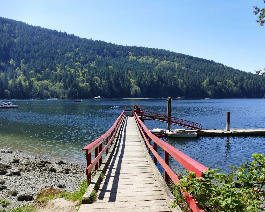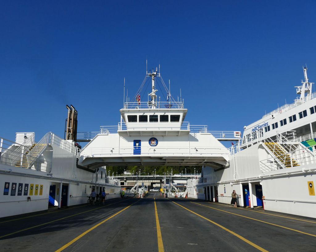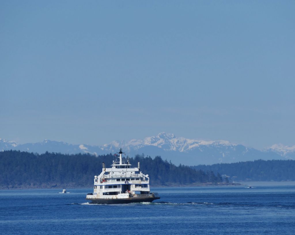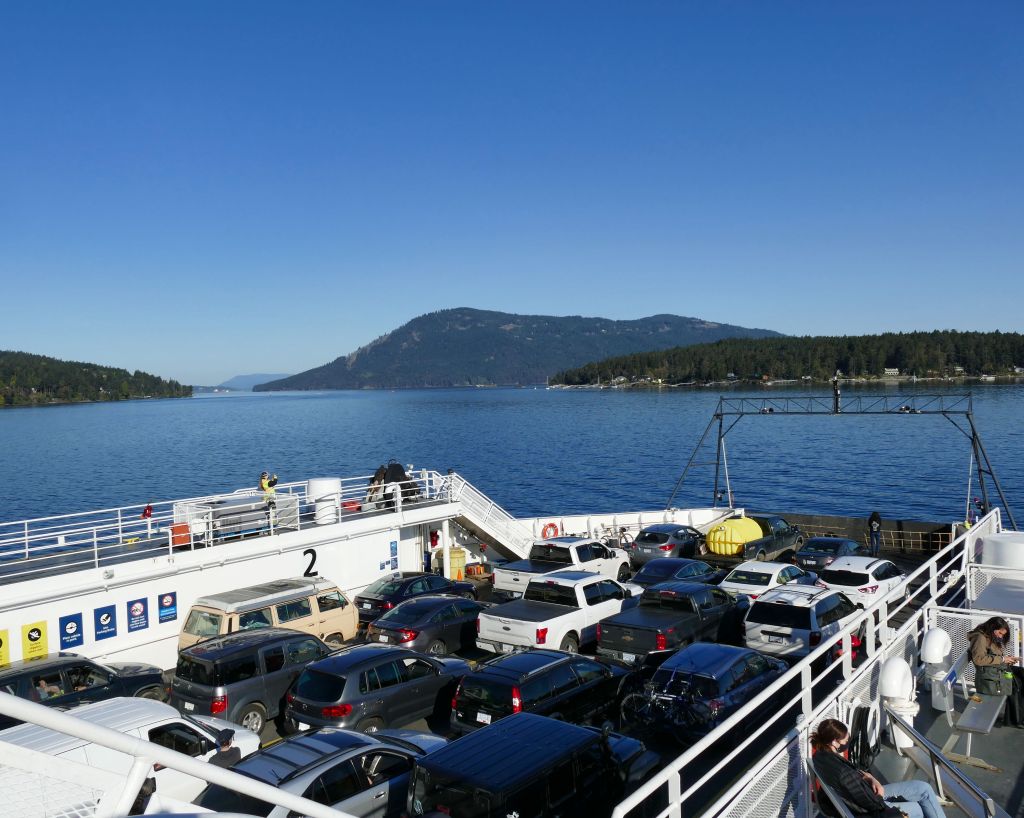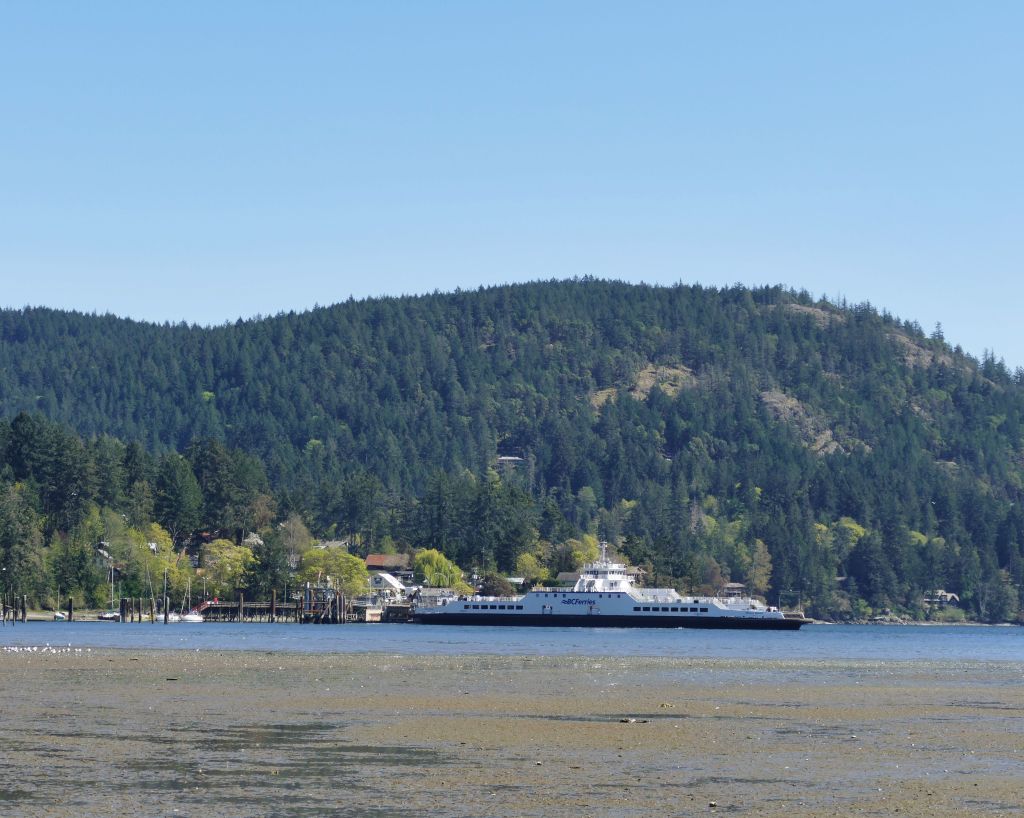 Samstag gegen 7:30 Uhr (es sind jetzt bereits 15°C) geht es mit zwei Bussen in ca. einer Stunde Fahrt bis zum Swartz Bay Ferry Terminal und von dort für 10,75$ in 30 Minuten auf die gegenüberliegende Insel, also eine von den 1000 Inseln rings um Vancouver Island.