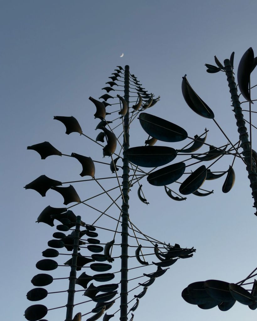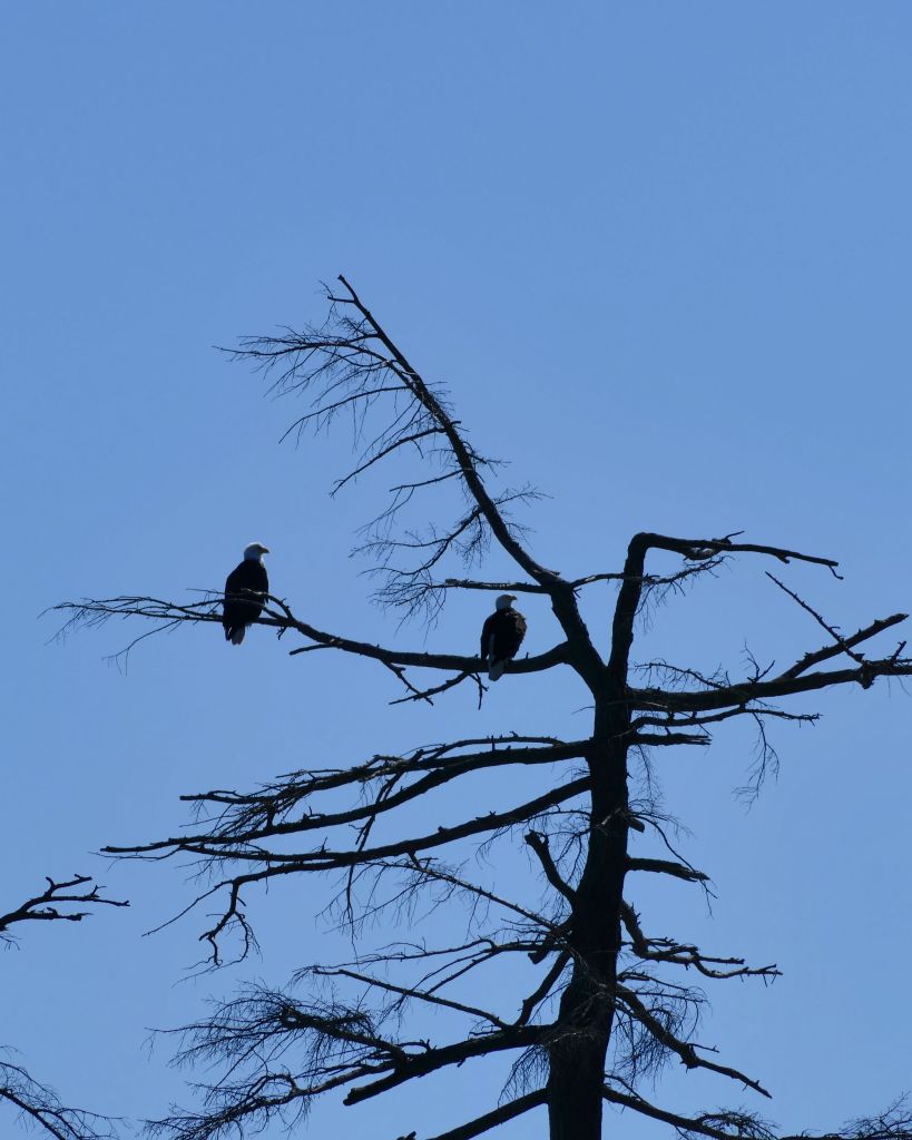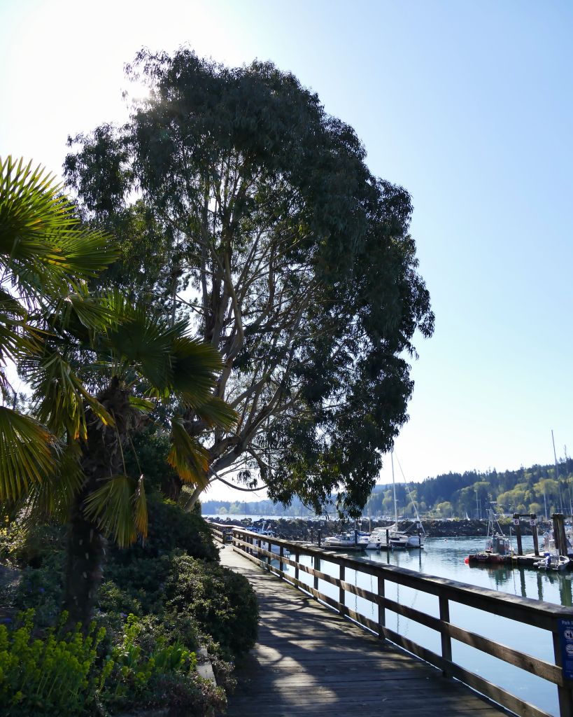 Der Großteil der kleinen Landzunge ist mit schicken Apartment Komplexen betoniert aber es gibt dennoch einen kleinen Trampelpfad bis zur Spitze vor. Muss wohl nicht erwähnen, das ich da natürlich hin muss. Die Apartments haben ein großes Windkunstobjekt vor der Tür, welches ich sehr schön finde und einige interessante Bepflanzungen wie Palmen und Eukalyptus. Ich komme mir fast vor wie in Australien. Dann muss man ein bisschen klettern. Da bereits einige Leute vor mir klettern und gerade Ebbe herrscht, entscheide ich mich für die leichtere Variante und laufe über Stock und Stein unterhalb entlang anstatt über den Hügel zu gehen. Vorn angekommen habe ich einen Blick auf eine winzige Insel auf der gerade zwei Weißkopfseeadler sitzen. Auf der anderen Seite kann man in den Hafen gucken. Herrlich hier.