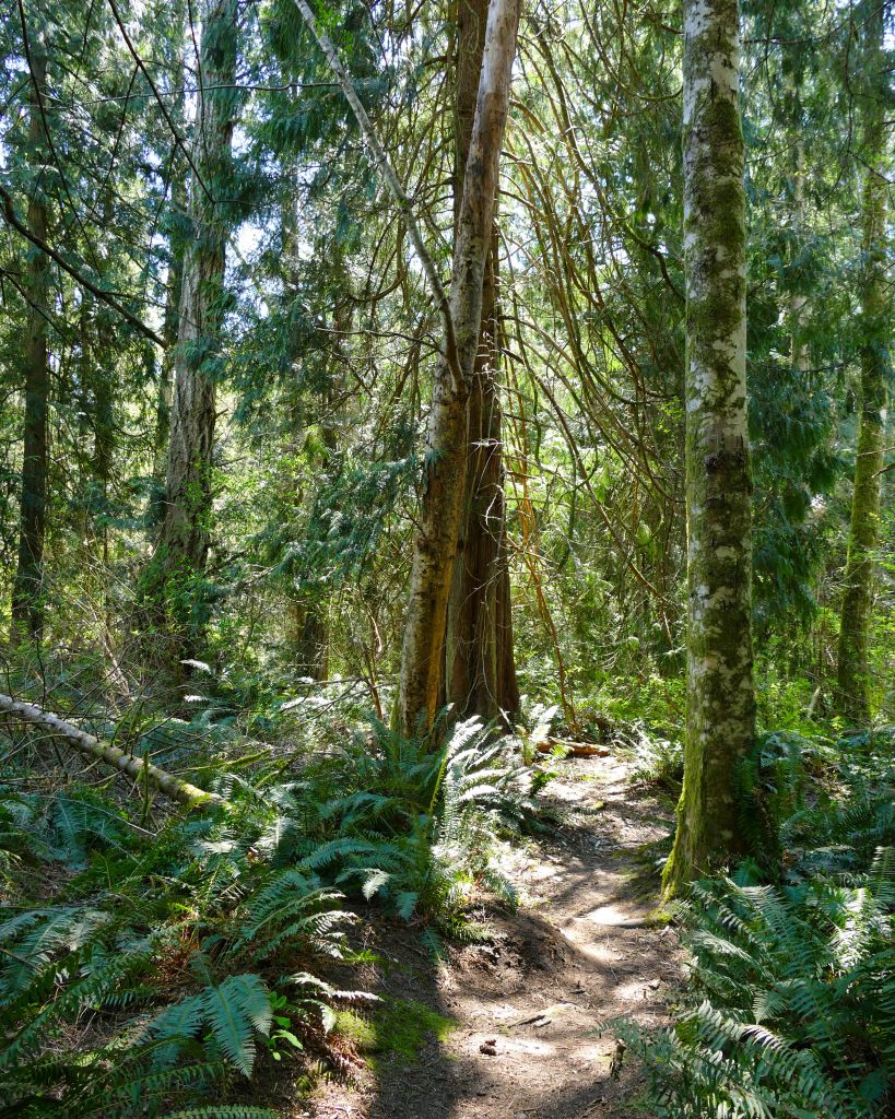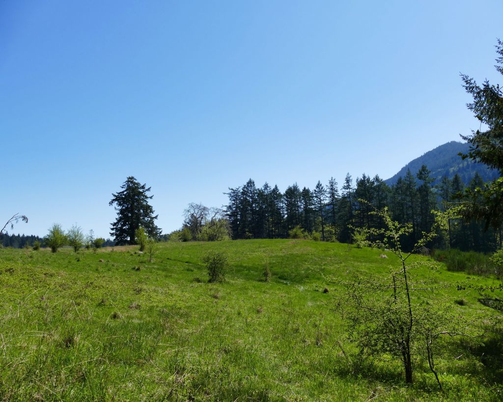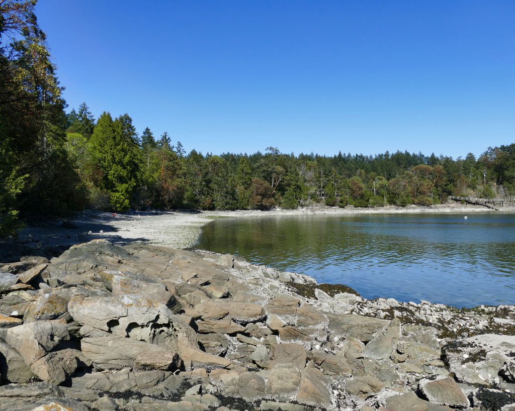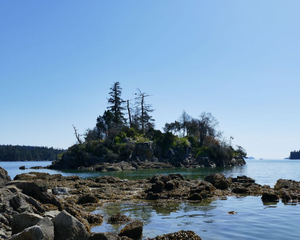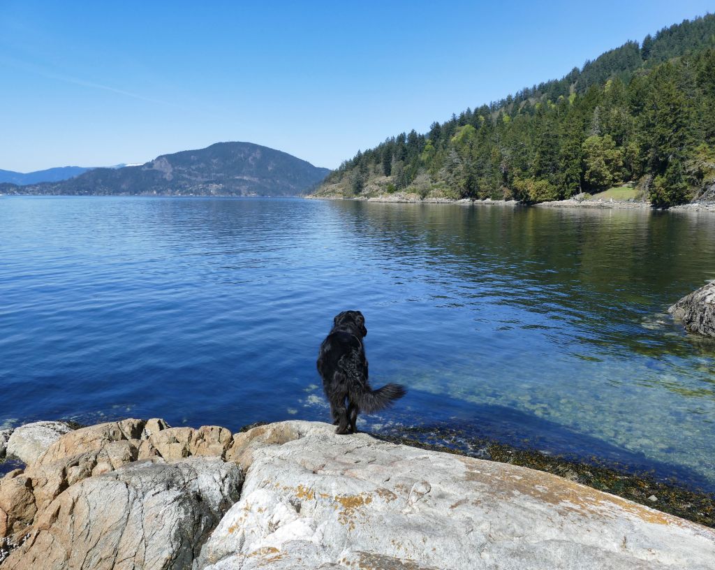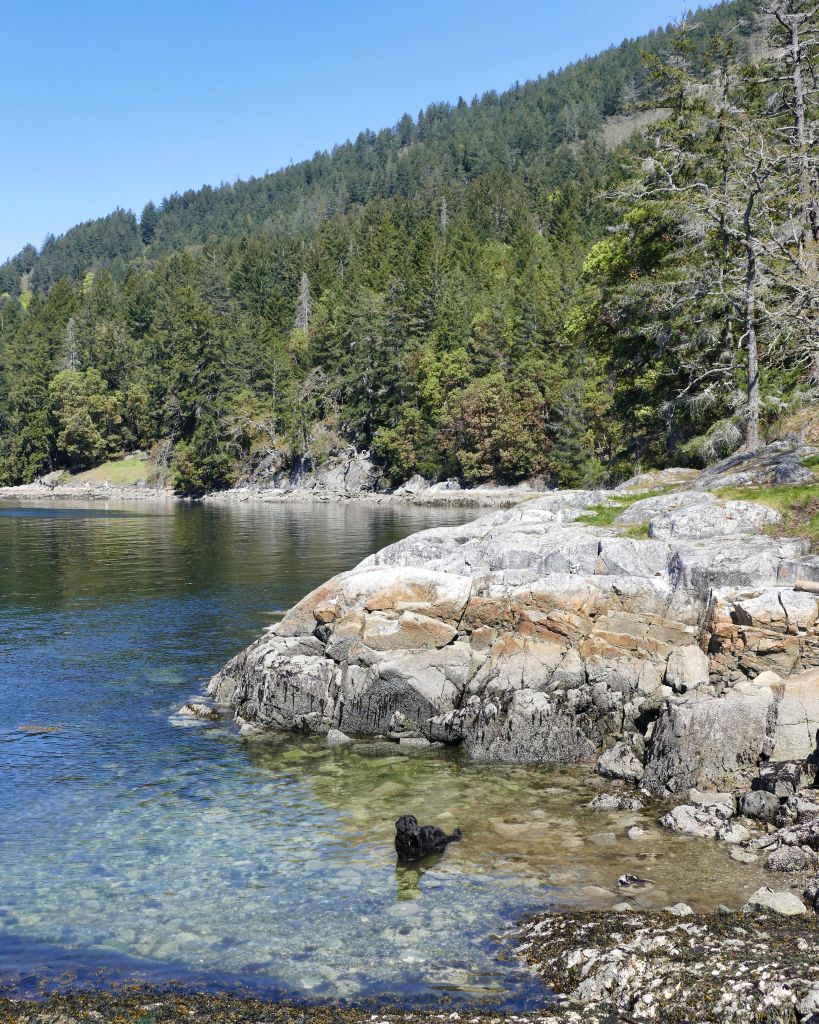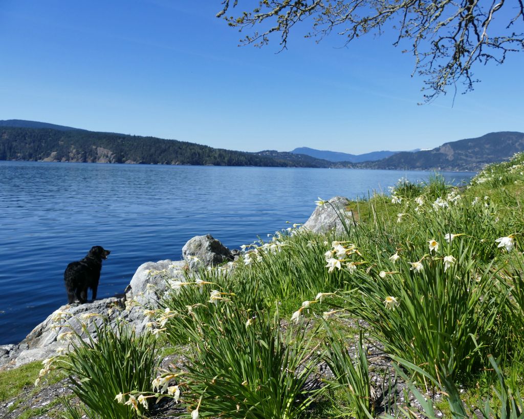 Für mich geht’s auf einem kleinen Wanderweg in den Wald hinein und immer bergauf. Ich muss kurz auf die Karte gucken um mich zu vergewissern, dass ich nicht aus versehen den Mt. Maxwell Aufstieg gewählt habe aber nein, es geht immer oberhalb der Wasserkante entlang ca. 2 km zu einem Aussichtspunkt, also eigentlich nur ein paar malerischen Steinen im Meer auf denen knorrige alte Garry Oaks (besondere Eichen) wachsen. Ich suche die Narzissen und bin enttäuscht, denn durch die Hitze der letzten Woche, ist von der gelben Pracht nichts mehr übrig und vom Daffodil Point bleibt nur noch der Point aber der ist auch ganz schön. Ein Pärchen hat ihren Hund dabei, welcher immer um mich herum saust und im Wasser spielen geht und auf dem Meer dümpelt ein Partysegelboot von dem nice Goa Dance Sounds in die Bucht herein schallen und mir so richtig Urlaubsgefühle machen.