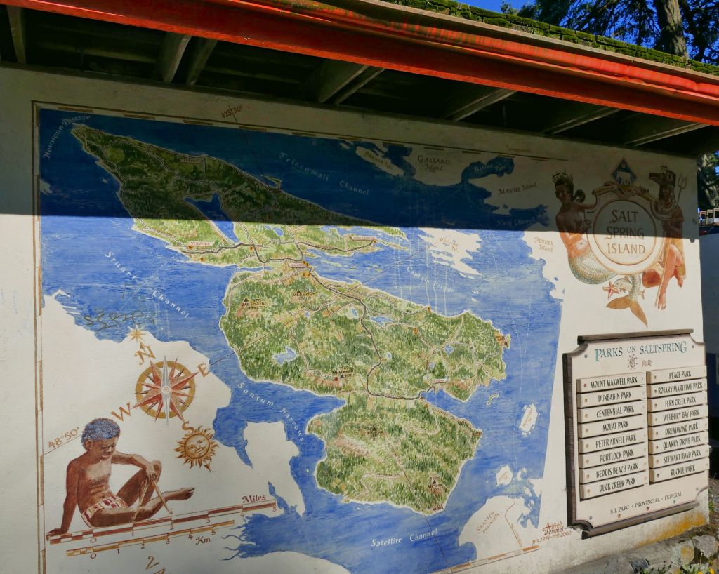 Am kleinen Fulford Harbour steht schon der Minibus bereit, der mich für 2,25$ in 25 Minuten Fahrt in das Hauptörtchen Ganges bringt. Die Fahrt mit den Locals ist schon mein erstes Highlight. Saltspring ist für seine Künstler und Hippies bekannt und im Bus sitzen gleich ein paar Althippies und ein alter Seebär, die sich über Gott und die Welt unterhalten während die schöne Landschaft an mir vorbei zieht. Hier ticken die Uhren ein bisschen anders und alles ist einfach ein Müh entspannter als auf der großen Insel oder gar auf dem Festland.