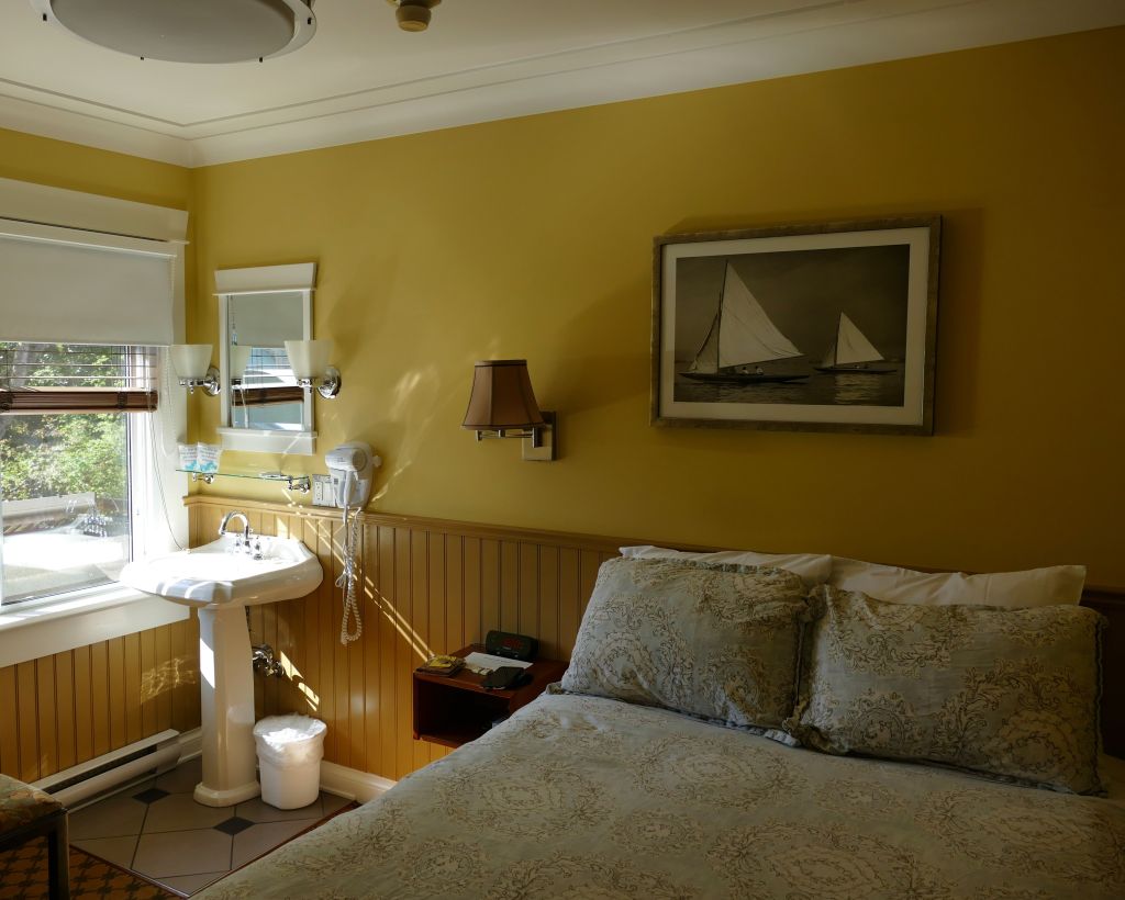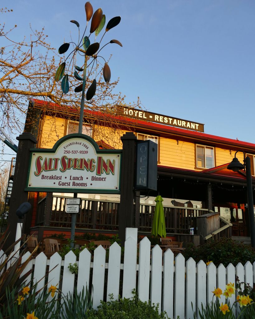 Viel Auswahl gab es nicht, vor allem wenn man, wie ich, mit dem Bus kommt. Wie gut, dass das Saltspring Inn genau gegenüber der Bushaltestelle und dem Besucherzentrum liegt, top Bewertungen bei Booking hat und mit 90$ die Nacht für ein Doppelzimmer, für kanadische Verhältnisse auch echt günstig ist. Allerdings gibt es im Zimmer nur ein Waschbecken. Duschen und auf die Toilette muss man in einem Gemeinschaftsbad aber auch die sind schön. Eine Dusche und Toilette und eine Toilette und das jeweils für Frauen und Männer getrennt. Richtig schöne saubere Badezimmer mit kleinen Seifen (die auf der Insel produziert werden), Handtüchern und Abschminktüchern. Die Zimmer sind klein aber gemütlich und kostenlos Kaffee kann man auch so viel trinken wie man will (das lass ich mir natürlich nicht zweimal sagen als alter Sparfuchs und Kaffeeliebhaber).