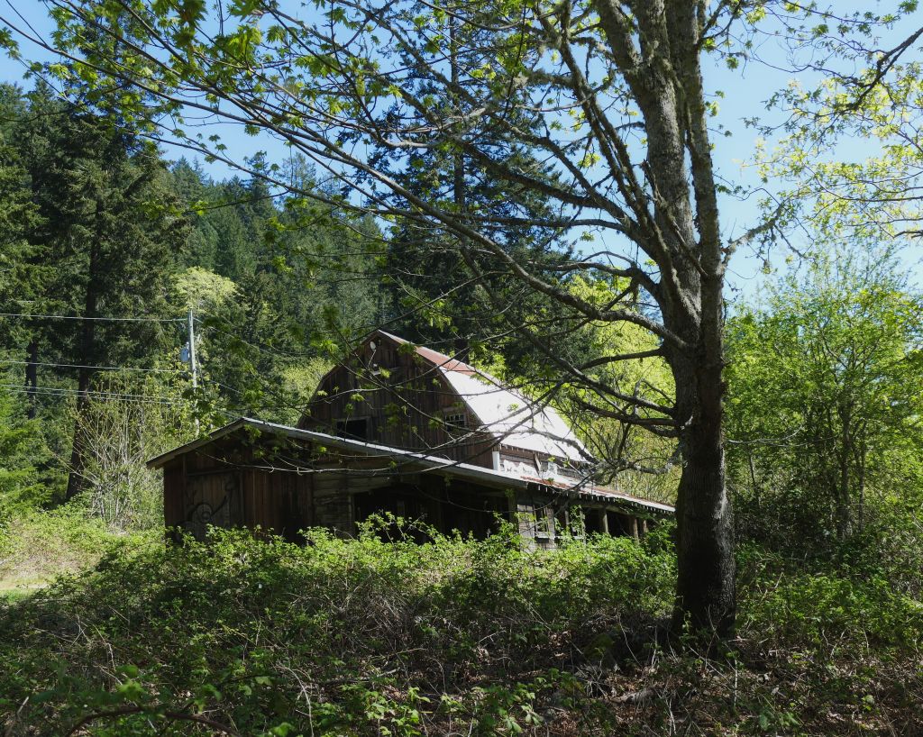 Nach einer halben Stunde muss ich mich wieder auf den Rückweg machen um den Bus nicht zu verpassen, denn der nächste würde erst 2 h später fahren. Ich denke, dass ich einen anderen Weg zurück nehmen kann und mache nochmal einen Abstecher in die Bucht um festzustellen, das es nicht wie erwartet von da flach ins Hinterland geht, sondern eine steile Wand vor mir liegt. Stattdessen nehme ich einen Trampelpfad in den Wald hinein, der auf keiner Karte auftaucht und hoffe einfach mal aufs Beste. Zwischendrin bin ich mir nicht mehr so sicher ob das jetzt nur ein Tierweg ist oder ob hier doch schon mal ein Mensch lang gekommen ist. Aber nachdem ich durch eine kleine Sumpflandschaft und über 4 Bäume gestiegen bin, komme ich auf der grünen Wiese wieder heraus und lande an einer weiteren lost place Farm, die wirklich bestens als Kulisse eines Horrofilms dienen könnte. Leider habe ich keine Zeit für weitere Erkundungen und eile zurück zur Bushaltestelle, wo auch wenige Minuten später der Bus eintrudelt mit dem ich bis zu einer Abzweigung vor der Fähre fahre.