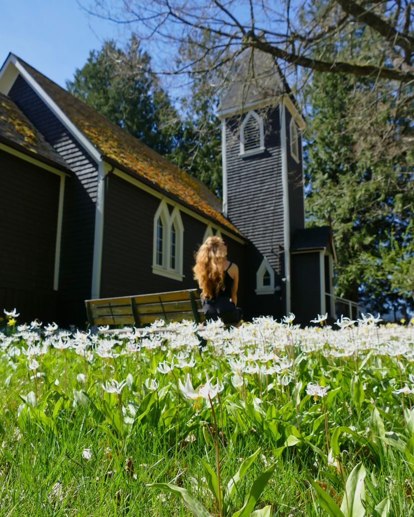 Ich habe auf der Fahrt eine kleine Kirche gesehen mit einer herrlichen Blumewiese davor. Ich steige also aus und laufe wieder ein Stück die Straße entlang zurück bis zur Kirche und das lohnt sich sehr. Richtig romantisch hier. Alles voll mit der einheimischen White Fawn Lily. Wunderschön.