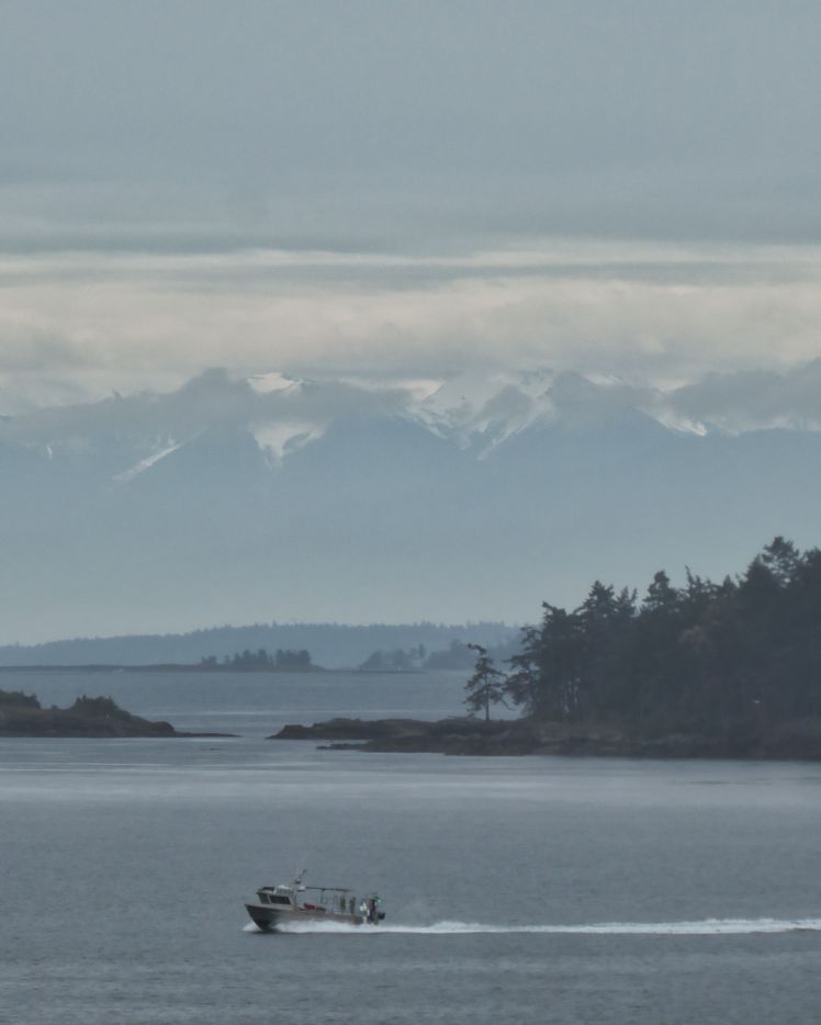 Wir schippern an den vers. Inseln vorbei und ich genieße den dramatischen Ausblick. Die US Berge werden allerdings in sanftes Sonnenlicht getaucht wohingegen der Rest einfach nur düster aussieht.