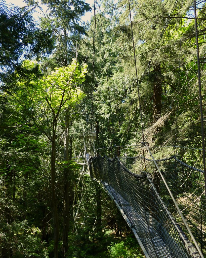Und da mein eigentlicher Grund ja der Baumwipfelpfad war, hab ich den auch gleich 2 Mal gemacht. Beim ersten Mal waren sehr viele sehr langsame Menschen vor mir und schnellere Menschen hinter mir und es war einfach nur anstregend. Dann wollte ich eine zweite Runde drehen, kam aber mit dem Betreiber ins Gespräch. Netter Kerl, der Forstwirtschaft studiert hat und auf das große Abholzen der kanadischen Wälder aufmerksam machen will. Er hat diese Anlage vor ein paar Jahren hier gebaut und inzwischen auch eine im brasilianischen Regenwald, wo seine Frau her kommt. War ein sehr interessantes Gespräch, allerdings hatte ich dann meine Chance verpasst noch eine Runde zu drehen bevor es wieder voll wurde, deshalb drehte ich dann noch mal eine komplett allein, kurz bevor der Garten schloss. Und das machte dann so richtig Spaß. Die kleinen Minihängebrücken zwischen den Bäumen sind ordentlich wackelig, sodass ich leichte Koordinationsprobleme hatte mit Handy, Kamera und meinen wackeligen Beinen. Man kommt nicht so sehr weit hoch und ist mehr in den Bäumen als über ihnen und der Weg ist auch extrem kurz aber dennoch hat es mir so viel Spaß gemacht hier entlang zu wackeln.